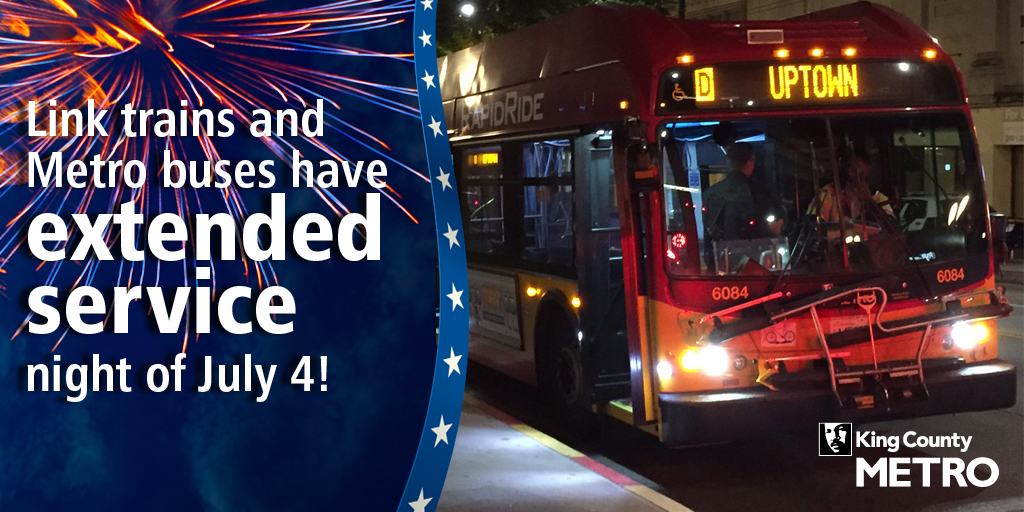 During the rest of the day, Metro will operate on a normal Sunday/Holiday schedule. More holiday schedule information is available at soundtransit.org or metro.kingcounty.gov/alerts/holidays.html. Some transit service will be re-routed due to various July 4 events. Customers should make sure they’re signed up for Rider Alerts, which provide information about special service to events, schedule changes and help riders plan trips around inclement weather. Just go to soundtransit.org/Subscribe-to-alerts or kingcounty.gov/depts/transportation/metro/alerts-updates.aspx.